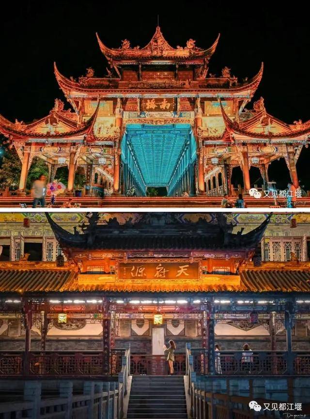 都江堰南桥位于都江堰宝瓶口下侧的岷江内江上,是南街与回应街之间的一座汜博壮丽的廊式古桥。夜幕来临,华灯初上,桥上一派流光溢彩,亮堂美丽,秀雅的灯光照亮城市泼墨般的夜色。 溜达于岷江河滨,看雕梁绣柱,碧瓦朱檐。烂醉在岷江凉爽的晚风中,总共的燥热与忧愁都随风磨灭,这是夏令独到的感官体验。